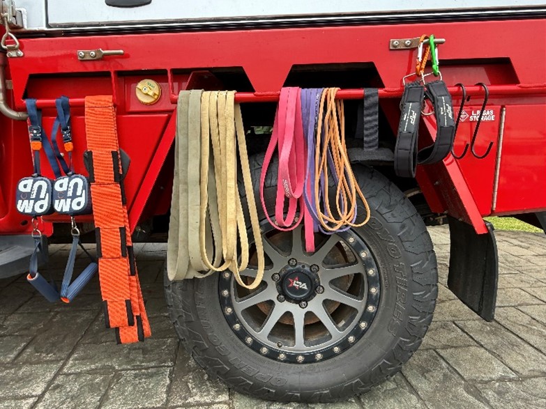 The PUMPS can anchor to a door or to any solid object with legs, arms, bars or struts. We use our vehicle roof rack, bull bar, camper tray side rails, wheel rims and/or our feet. There is a quick release adjustable latch strap for securing the PUMPS and we also use ‘S hooks’ for fast re-positioning with the roof rack mounted exercises – see the image below.